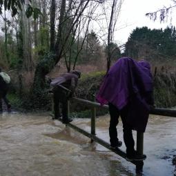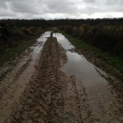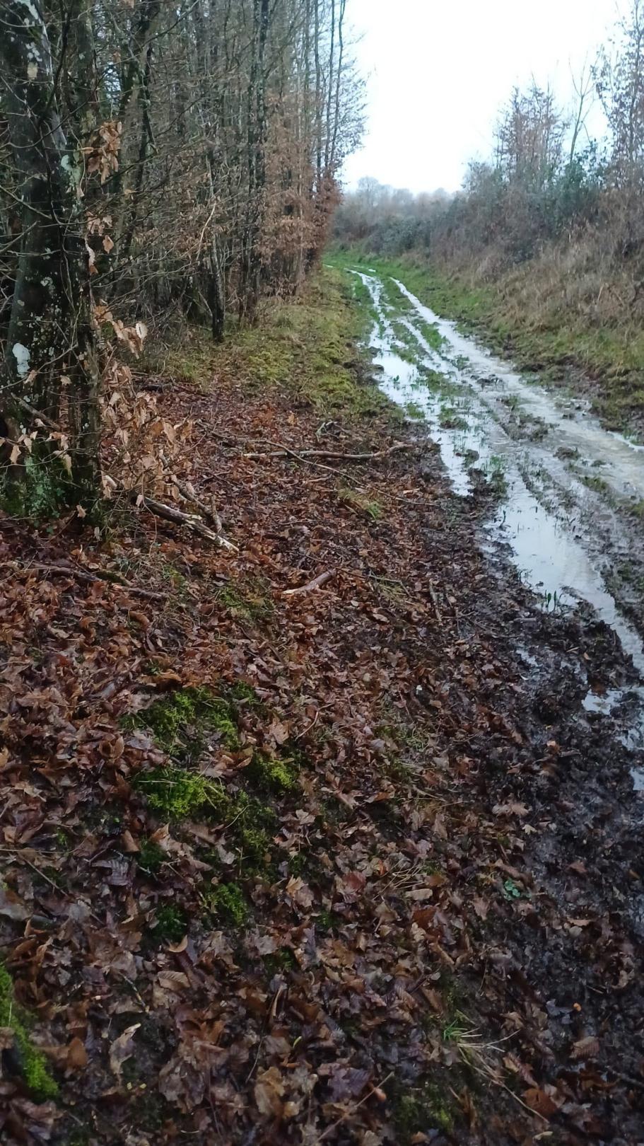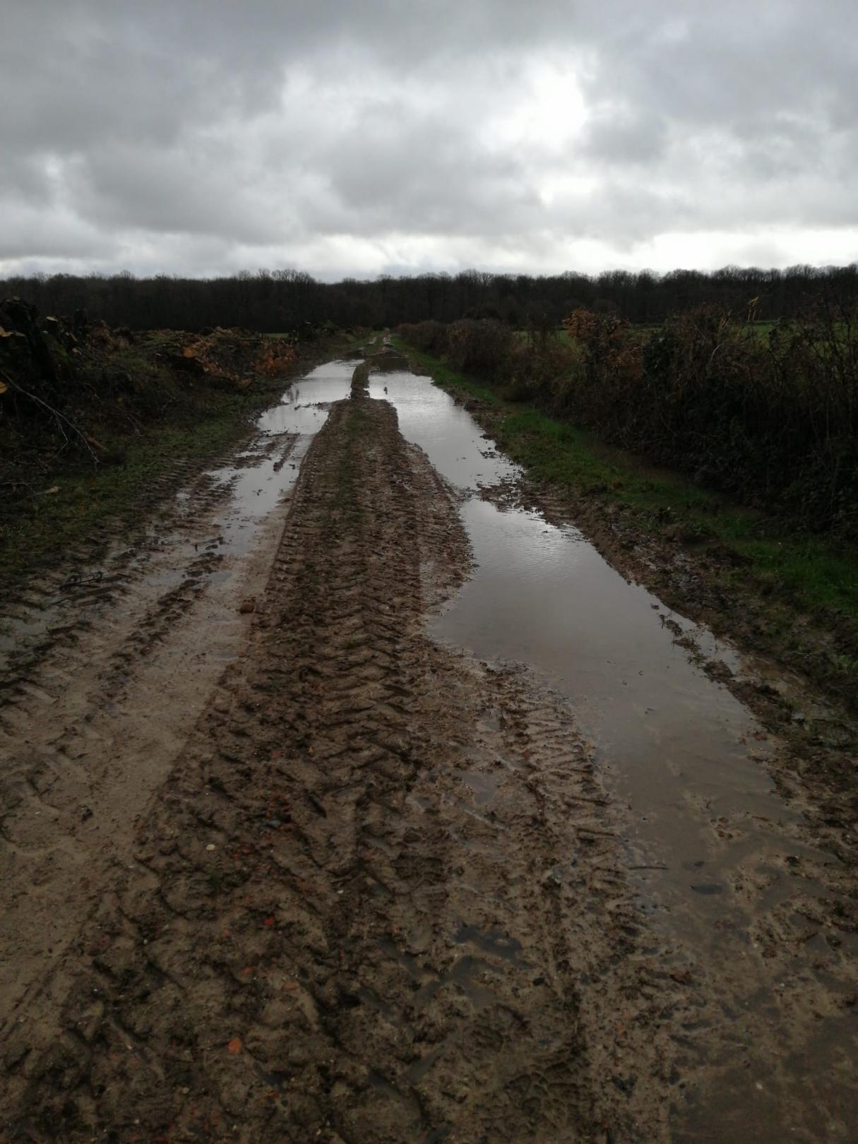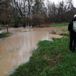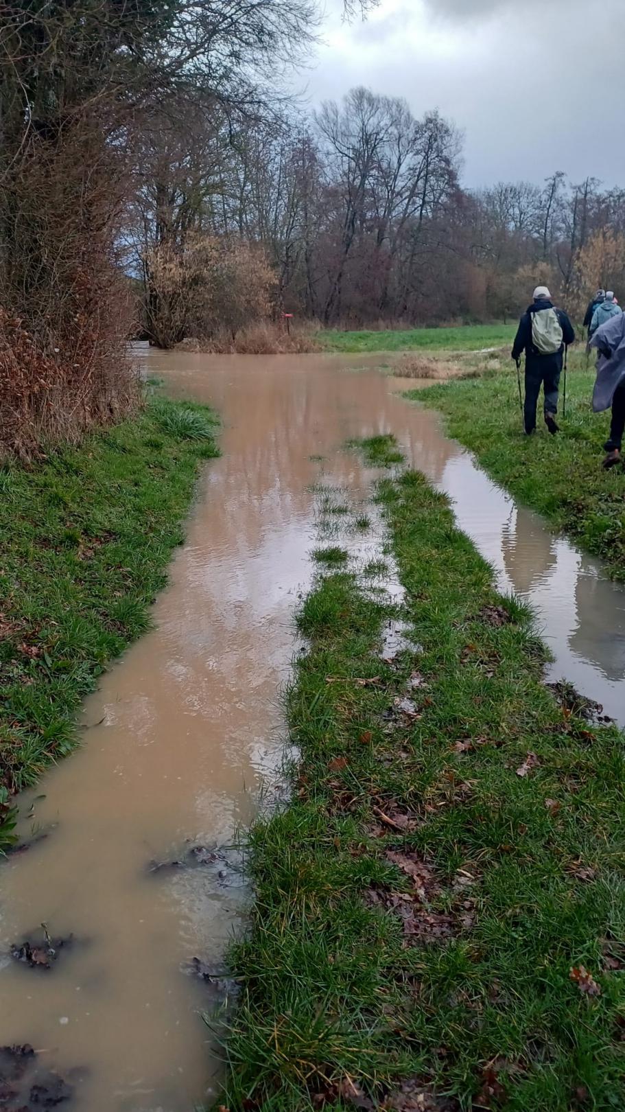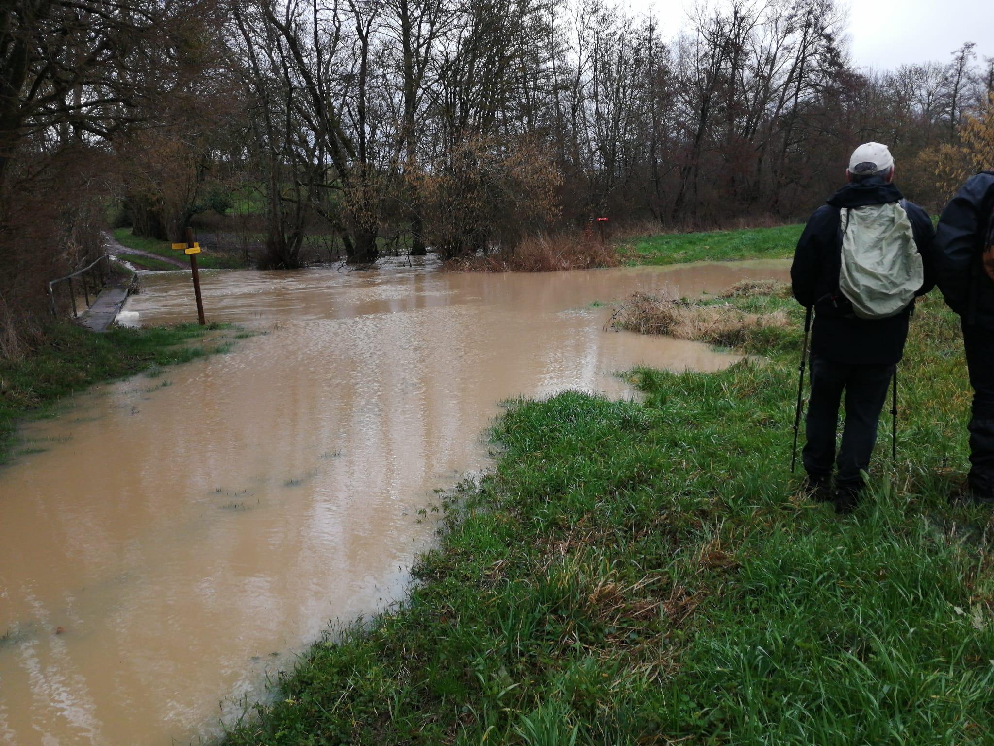 allons être très vite dans l'ambiance, car, dès le départ, sur le chemin de la Fontaine aux Loups, un passage inondé nous oblige à traverser sur